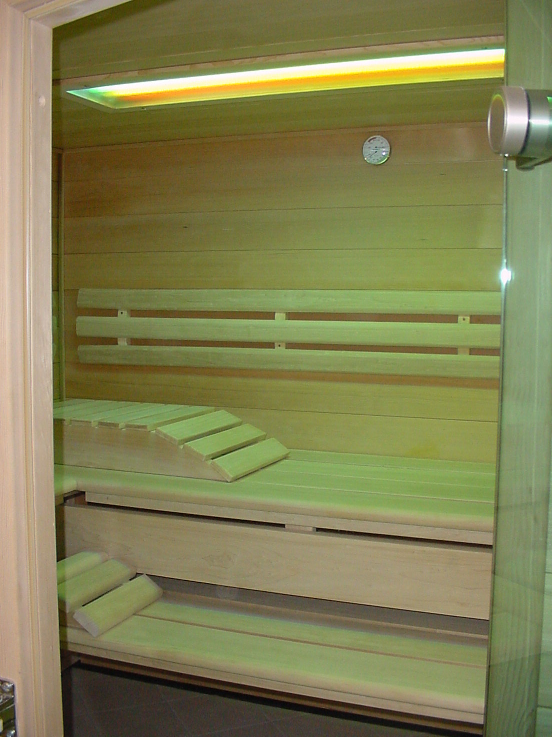 Aufwertung der Koll-Exquisit-Sauna: Kolldarium serienmäßig; Innen Profilbretter waagerecht, und ähnlich wie die Liegeflächen im Breitprofil. |