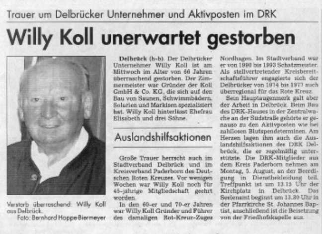 1993 | Neben seinen vielfältigen Aufgaben im elterlichen und eigenen Betrieb, absolviert Dirk Koll eine Ausbildung zum Rettungssanitäter beim Deutschen Roten Kreuz, dem er schon seit 1975 (Jugendrotkreuz) angehört. Als ehrenamtlicher Rettungssanitäter ist er auf verschiedenen Rettungswachen im Kreis Paderborn tätig. Da die Stadt Delbrück über nur einen Rettungswagen verfügt, wird Dirk Koll als Mitglied einer SEG (Schnelleinsatzgruppe) in den Folgejahren teils mehrfach wöchentlich zur Besetzung eines 2. Rettungswagen per Funkmeldeempfänger eingesetzt. | ||||||