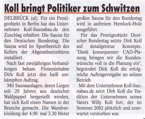 Falls Sie noch weitere Berichte über Koll in Printmedien entdeckt haben, so bitten wir um Mitteilung oder einen Scan zur Veröffentlichung: pressespiegel@koll-sauna.de | ||||