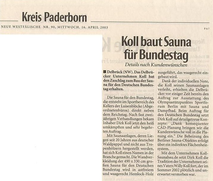 Falls Sie noch weitere Berichte über Koll in Printmedien entdeckt haben, so bitten wir um Mitteilung oder einen Scan zur Veröffentlichung: pressespiegel@koll-sauna.de | ||||