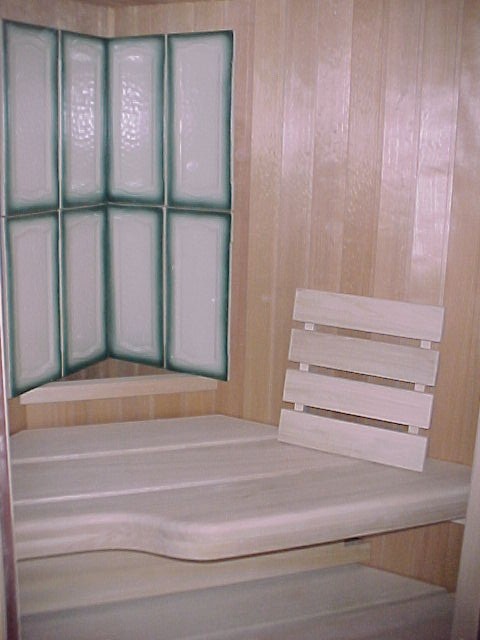 Bad-Sauna 140 x 140 mit Unterbank-Eckheizsystem 230 V / 3 KW, im hinteren Bereich des Wärmekanals Saunakacheln aus Keramik (Sonderausstattung). |