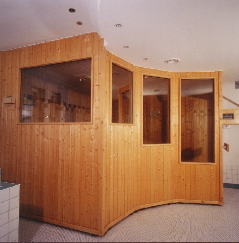 Sauna mit Abrundung und Glaselementen. Rechts neben der Tür Technikschrank mit Leistungsteil und Steuergerät.