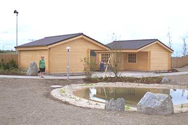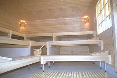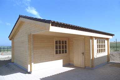 Blockhaussauna mit Vorraum und freitragender Eingangsüberdachung. |